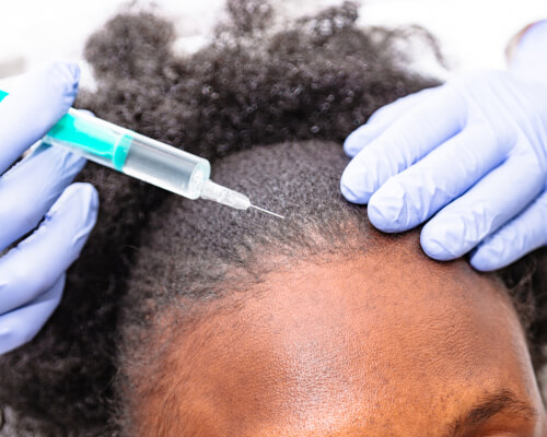 Mesotherapy for hair loss involves injecting a solution into the scalp to rejuvenate and restore hair. The micro-injections are very superficial, penetrating only the skin, making it a non-surgical and easy-to-administer treatment you can receive in our office. After the treatment, you can immediately return to your regular daily activities. The technology behind mesotherapy has been used for decades to restore volume to thinning hair. It promotes significant hair regrowth for both men and women experiencing hair loss, and it is based on scientific evidence that most hair loss problems stem from reduced blood circulation to the scalp, lack of proper nutrients, and hormone imbalances around the hair follicle.